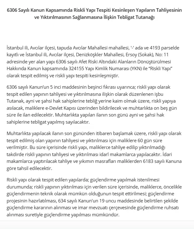 6306 Sayılı Kanun Kapsamında Riskli Yapı Tespiti Kesinleşen Yapıların Tahliyesinin ve Yıktırılmasının Sağlanmasına İlişkin Tebligat Tutanağı 11.11.2025